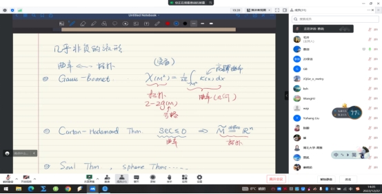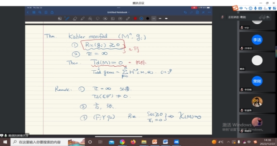 报告中,葛剑教授介绍了流形具有几乎非负(截面或Ricci)曲率的概念,详细说明了该概念提出的背景和该类流形已有的一些经典结论,给出了近期他与合作者在这类曲率假设下得到的几个关于流形的分类和拓扑的相关结论,并简要地展示了结论证明的思路。参会师生通过此次讲座,对具有几乎非负曲率的流形有了一定的认识,丰富了自身的知识。
