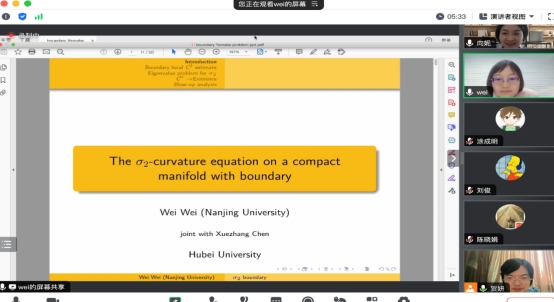 曲率问题和预定边界非负平均曲率的存在性结果。这里局部估计在blow up分析和存在性结果的证明中起到了重要作用。报告后,大家就相关问题进行了充分讨论,大家表示受益匪浅。